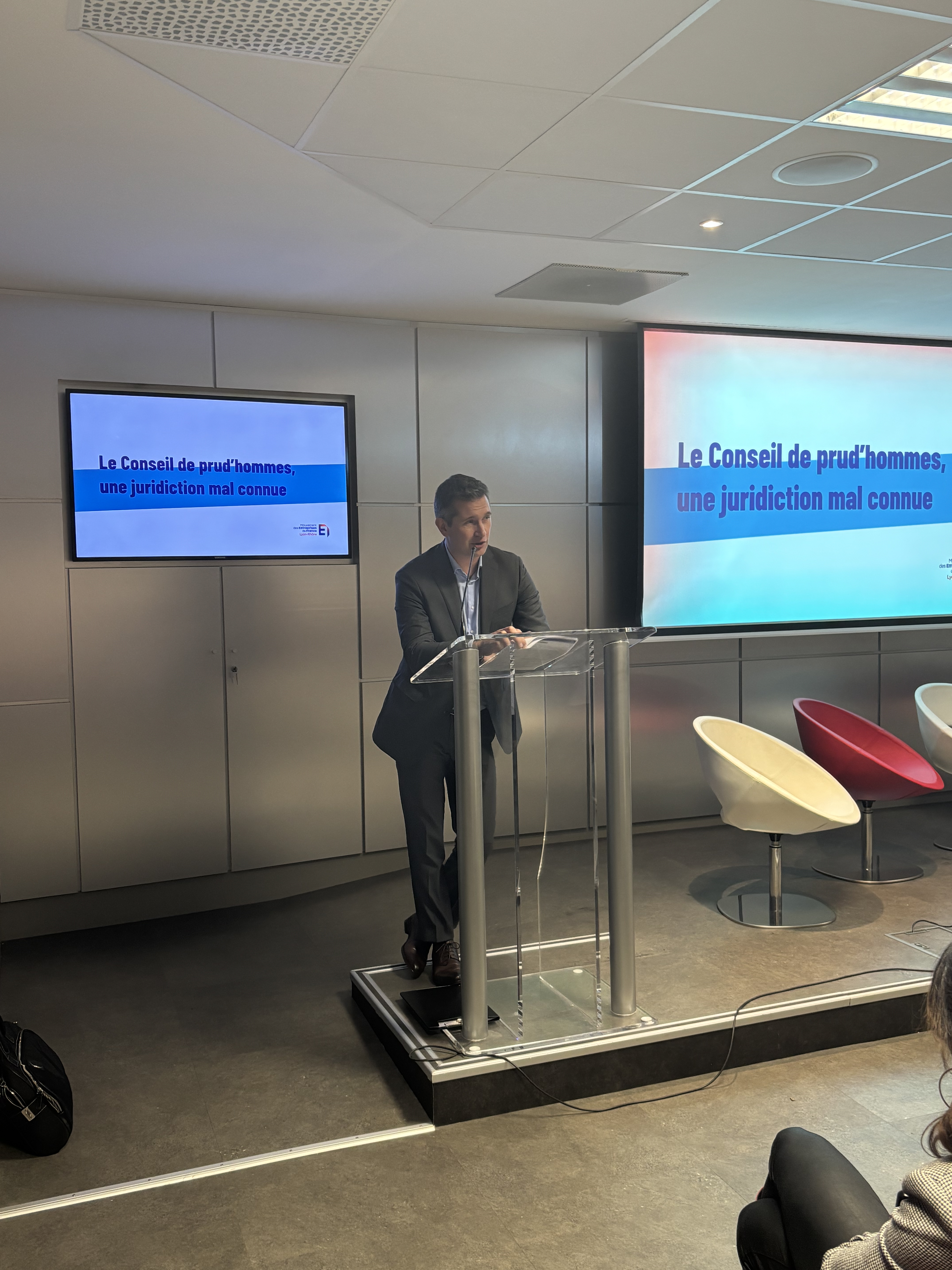 Dans une première séquence, David BERNARD, président employeur du conseil de prud’hommes de Lyon, a présenté cette juridiction et ses spécificités : Juridiction paritaire née à Lyon sous Napoléon, le CPH compte 5 sections. Exception française au regard du droit européen, il est composé de magistrats professionnels (par opposition aux magistrats de carrière). La procédure devant les prud’hommes comporte une phase préalable de conciliation. En 2024, les CPH de Lyon et de Villefranche comptent respectivement 149 et 20 conseillers employeurs. Soulignant que les futurs nouveaux juges ne seront pas seuls dans l’exercice de leur fonction, David BERNARD a sollicité le concours de Patrick FOURNIALS, formateur agrée par EDS, pour rappeler le caractère obligatoire des formations. Pour conclure, le président du CPH de Lyon s’est félicité de l’engagement des conseillers employeurs du Rhône.